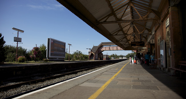 Stratford upon Avon Railway station is located in Warwickshire connecting Shakespeare's Town with Birmingham and London . The station has three platforms. Platform one is used by the trains to Birmingham and some London services. Platform three is used by the London services and platform two is used by the steam train specials. Trains to Birmingham run hourly by London Midland Trains and trains to London run every two hours by Chiltern Railway.